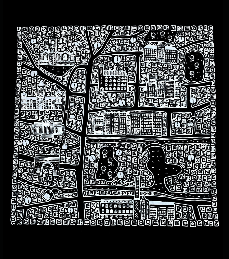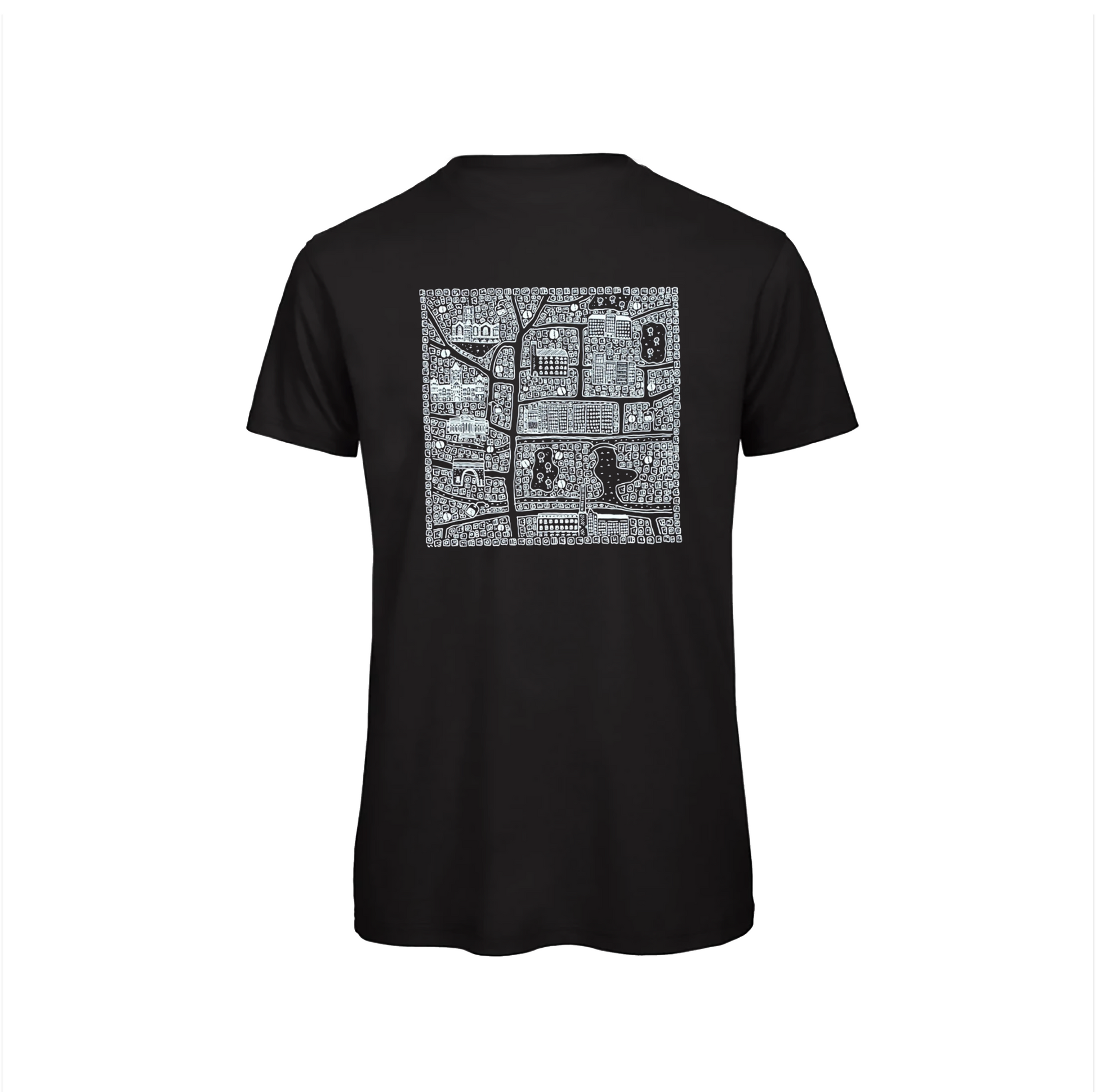 This Black Men's T-shirt features a doodle map containing the historic architecture of Stockport by famous artist Dave Draws.